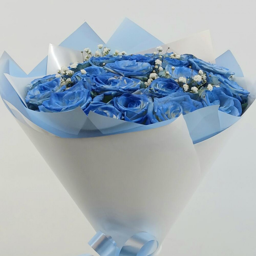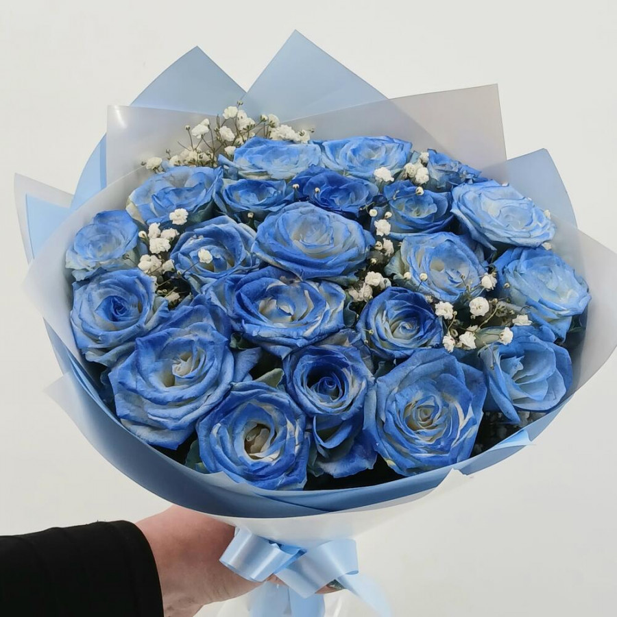 На фото букет из 21 голубой розы. В составе: роза 21 шт, дизайнерская упаковка 1 шт, атласная лента 1 шт, . Все цветы свежие и ароматные, букет красиво оформлен и отлично подходит для подарка. Доступна доставка цветов или самовывоз.