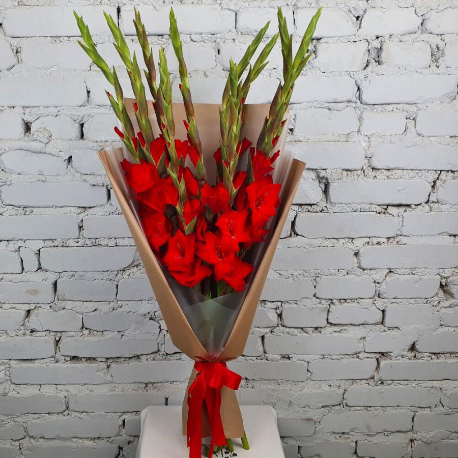 На фото букет 9 красных гладиолусов. В составе: гладиолус 9 шт, крафт-бумага 2 шт, атласная лента 1 шт, . Все цветы свежие и ароматные, букет красиво оформлен и отлично подходит для подарка. Доступна доставка цветов или самовывоз.